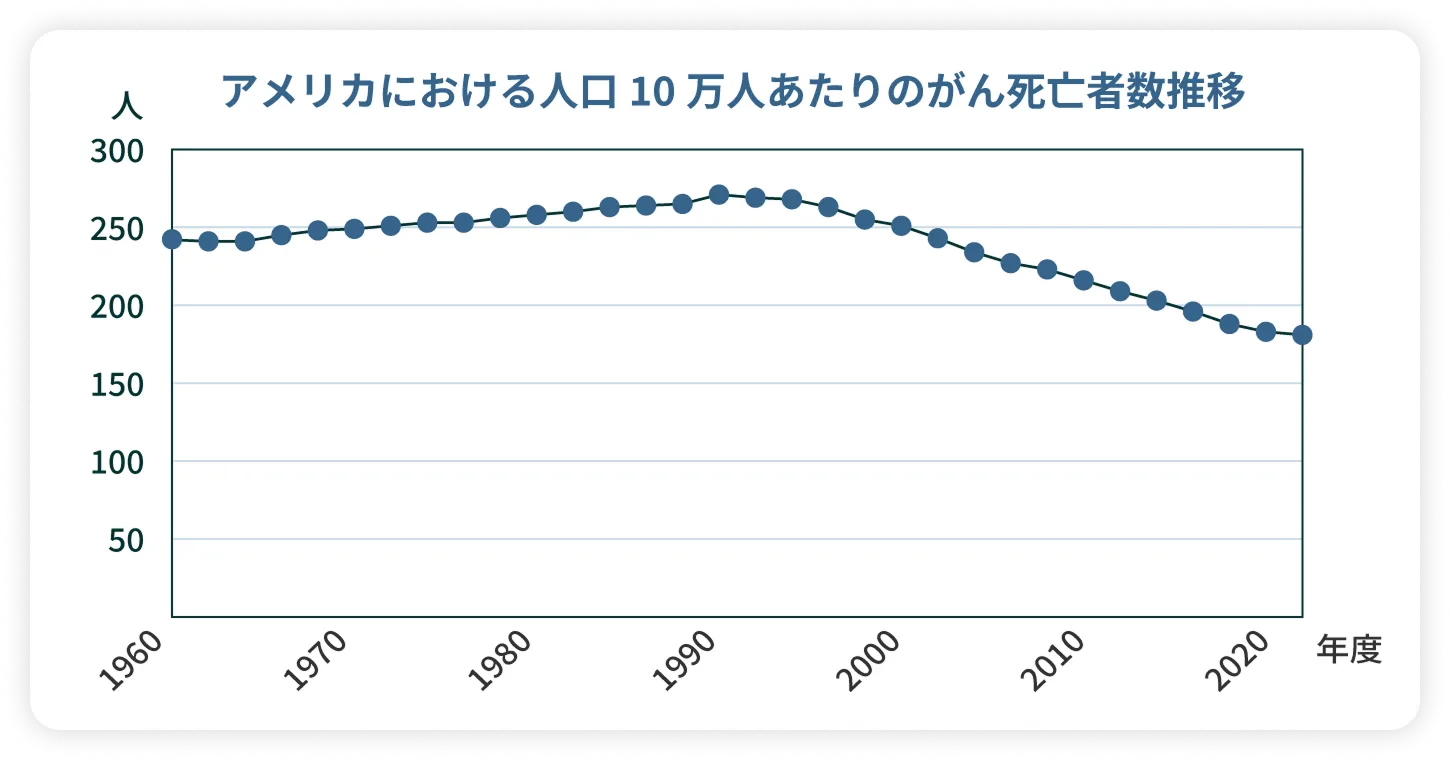アメリカでは、日本における「標準治療」以外の様々な治療法がおこなわれるようになってきており、人口10万人あたりのがん死亡数は以前より下がっています。
